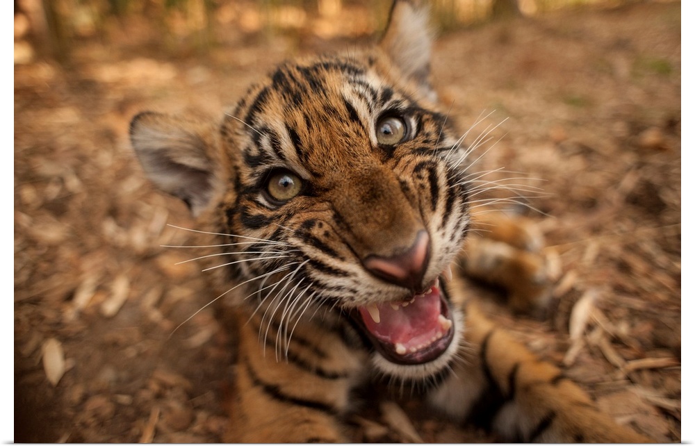 <p>Close-up portrait of the critically endangered Sumatran tiger cub (panthera tigris sumatrae) lying on the ground with its mouth open, showing its teeth, atlanta, georgia, united states of America.</p>