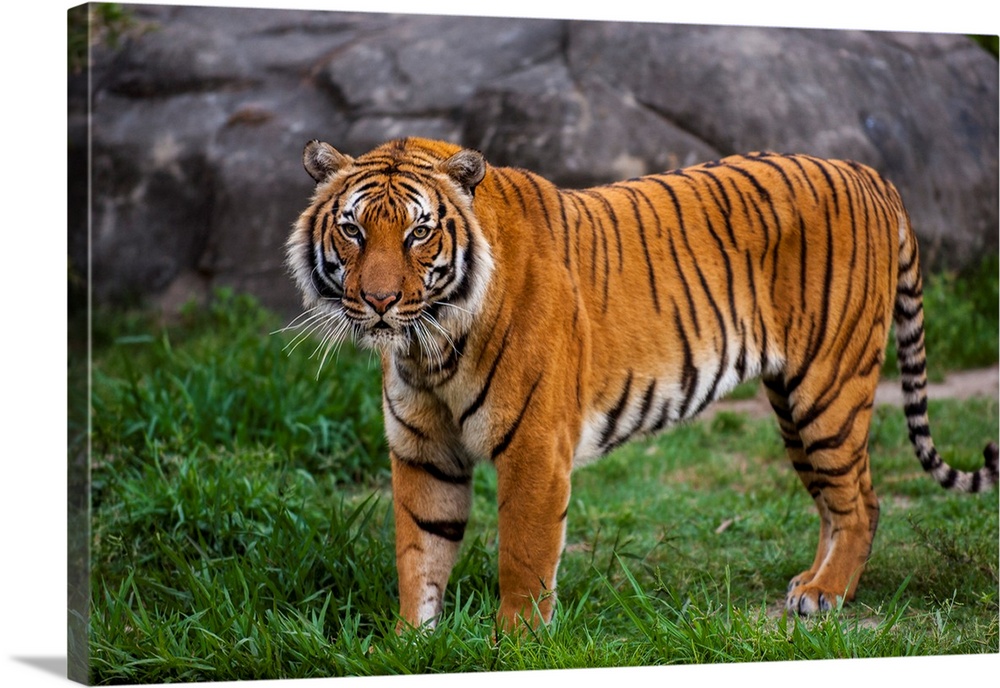 <p>Portrait of the Indochinese tiger (panthera tigris corbetti) standing in its enclosure at a zoo, an endangered animal, Houston, Texas, united states of America.</p>