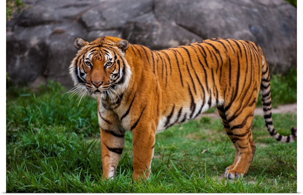 <p>Portrait of the Indochinese tiger (panthera tigris corbetti) standing in its enclosure at a zoo, an endangered animal, Houston, Texas, united states of America.</p>