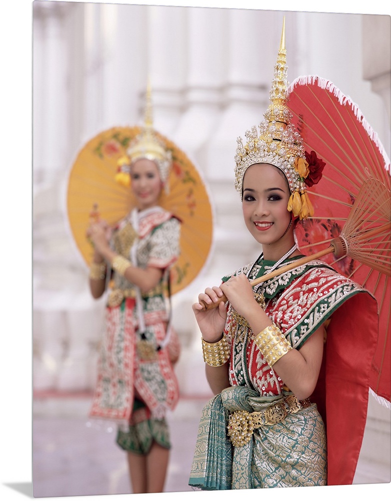 <p>Portrait of two dancers in traditional Thai classical dance costume, smiling and looking at the camera, Bangkok, Thailand, Southeast Asia, Asia</p>