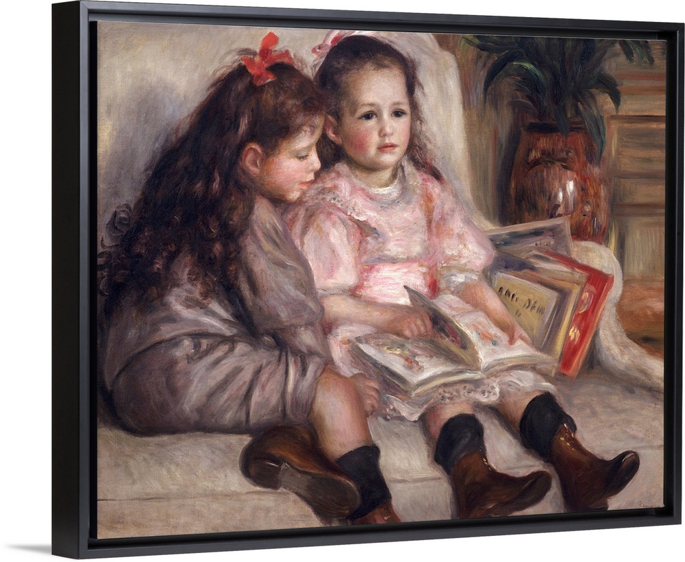 <p>Landscape, oversized classic painting of two young girls with dark, long hair, wearing dresses and boots, sitting next to each other on a chair while reading through a stack of books.</p>