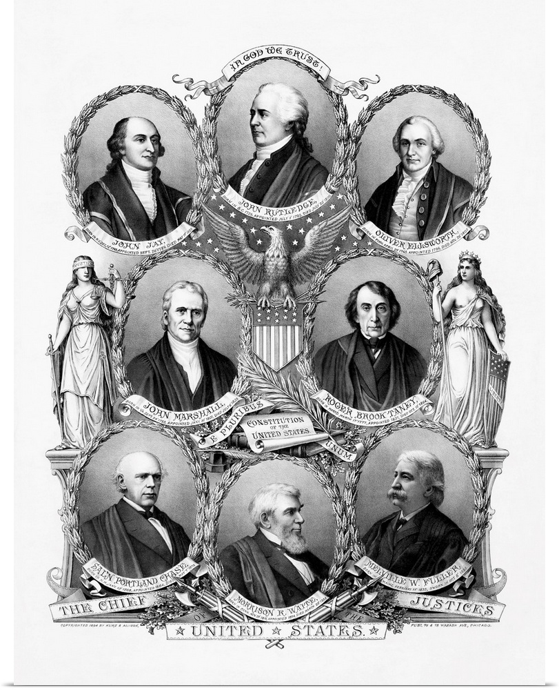 <p>Portraits of eight Chief Justices of the United States Supreme Court flanked by female figures signifying Justice on the left and the other signifying Liberty on the right. In the United States, the chief justice is the chief judge of the Supreme Court and is ranked at the highest position in the Federal Judiciary hierarchy.</p>