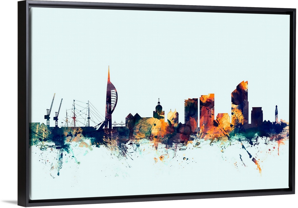<p>Dark watercolor silhouette of the Portsmouth city skyline against a light blue background.</p>