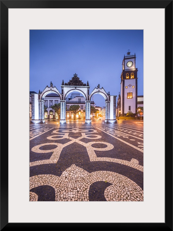 <p>Portugal, Azores, Sao Miguel Island, Ponta Delgada, Portas da Cidade gate and the Igreja Matriz de Sao Sebastiao church</p>