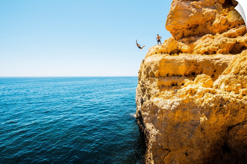 <p>Portugal, Algarve, Faro district, Lagoa, Carvoeiro, Algar Seco. Boys jumping off the cliff into the Atlantic Ocean.</p>