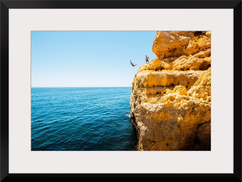 <p>Portugal, Algarve, Faro district, Lagoa, Carvoeiro, Algar Seco. Boys jumping off the cliff into the Atlantic Ocean.</p>