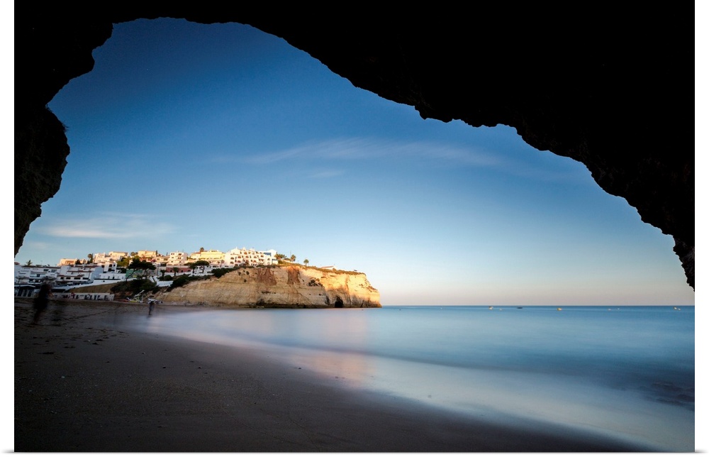 <p>Portugal, Faro, Carvoeiro, View from a sea cave of the fishing village of Carvoeiro perched on a reef at sunset.</p>