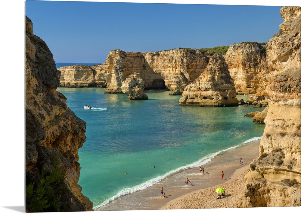 <p>Portugal, Faro, Armacao de Pera, Algarve, Praia da Marinha, Praia da Marinha beach and rock formations on coast with few people on the beach as a wave breaks</p>