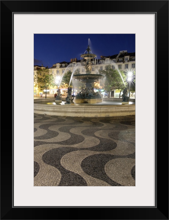 <p>Portugal, Lisbon. Rossio Square at night. Bronze Mermaid Fountain.</p>