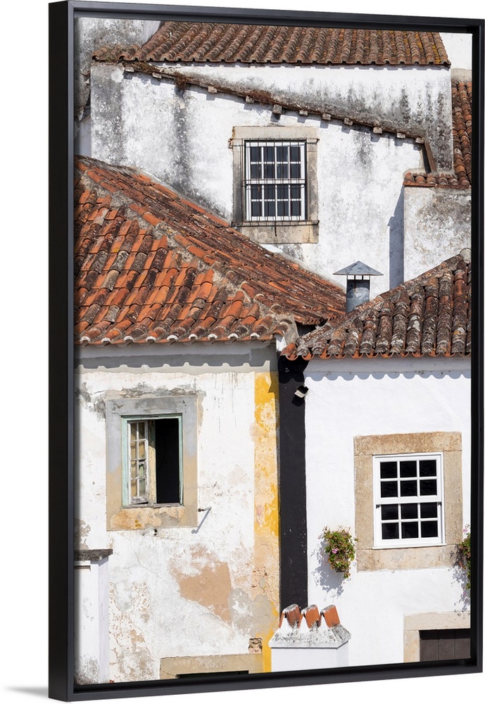 <p>Portugal, Obidos. Ancient, red, terra cotta tiled roof tops, lines. Old windows.</p>