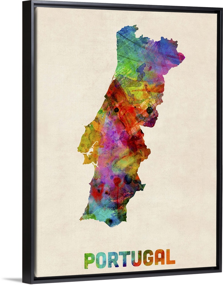 <p>Contemporary piece of artwork of a map of Portugal made up of watercolor splashes.</p>