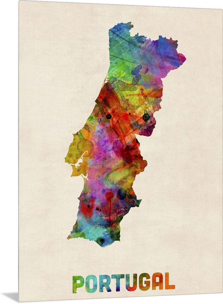 <p>Contemporary piece of artwork of a map of Portugal made up of watercolor splashes.</p>