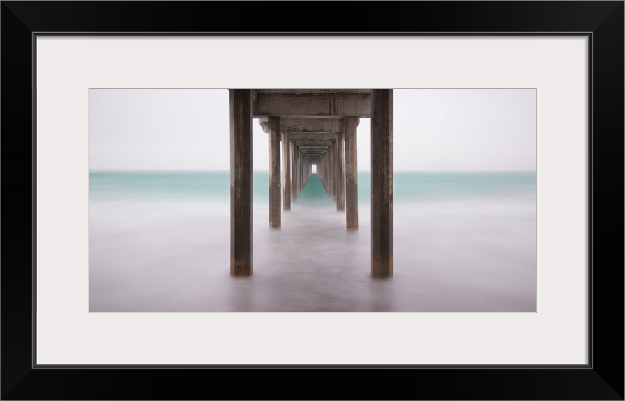 <p>A contemporary painting of the bottom side of a pier at a beach.</p>