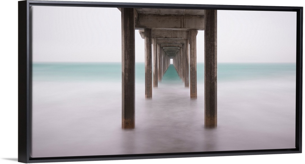 <p>A contemporary painting of the bottom side of a pier at a beach.</p>
