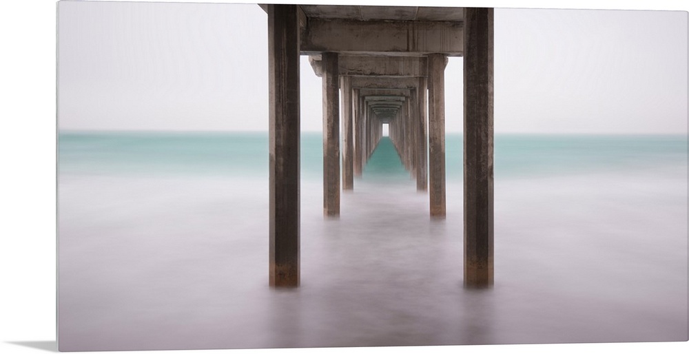 <p>A contemporary painting of the bottom side of a pier at a beach.</p>