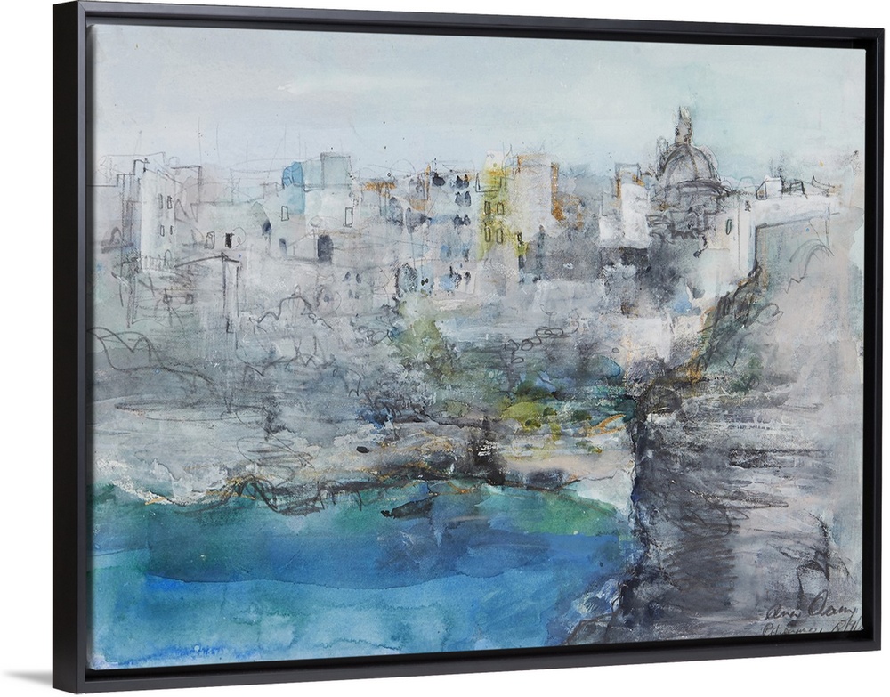 <p>A beautiful abstract landscape painting of the Italian coastal town of Positano in muted blues and greys, accented with charcoal scribbles. A very light and airy art piece</p>
