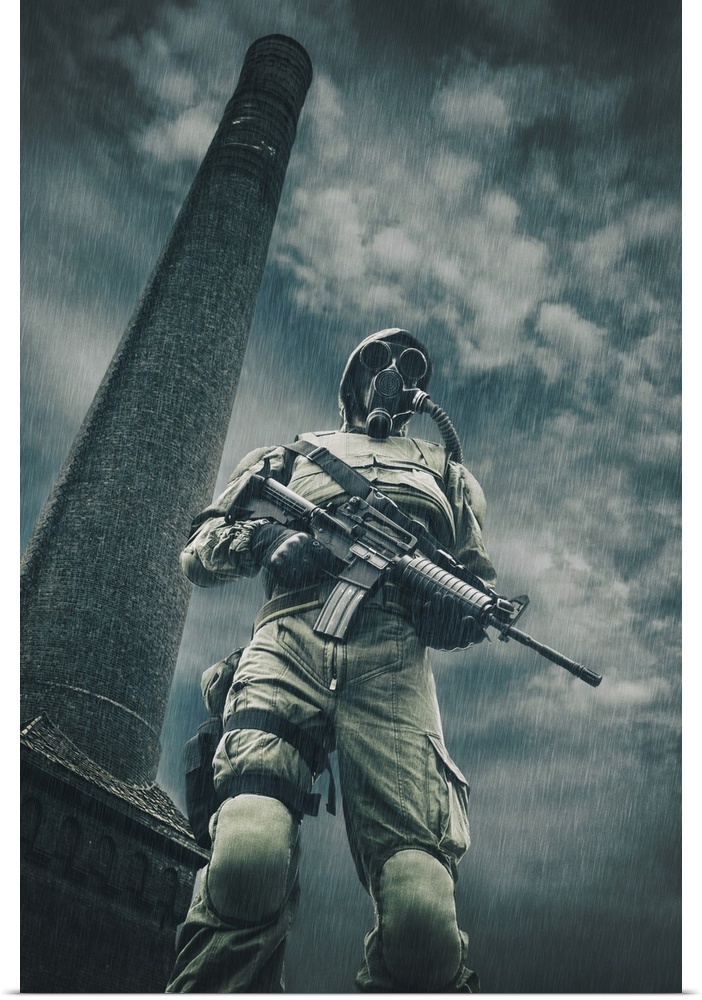 <p>Post apocalypse survivor in tatters and gas mask on the ruins of a destroyed city.</p>