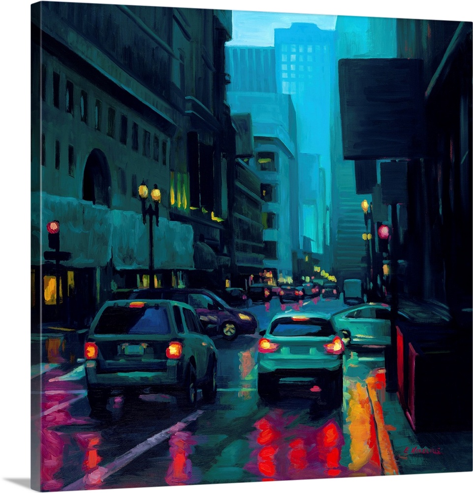 <p>Erica Norelius is a contemporary oil painter known for her luminous urban scenes that transform the geometry of the city into poetic reflections on modern life. Viewing the cityscape as a living landscape, she explores the interplay of light, atmosphere, and human presence — rain-slicked streets, glowing intersections, and quiet vignettes caught between movement and stillness. Norelius begins each work with notan studies that distill complex environments into elegant, simplified shapes. Her painterly realism and meditative attention to tone and hue reveal beauty within the everyday.</p>