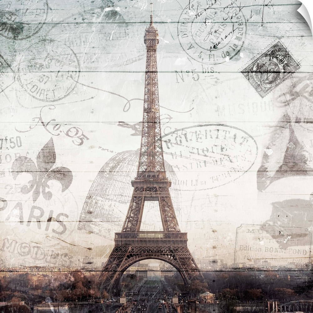 <p>Square photograph of the Eiffel Tower with a Paris cityscape underneath and a faint wood panel and postage stamp overlay.</p>