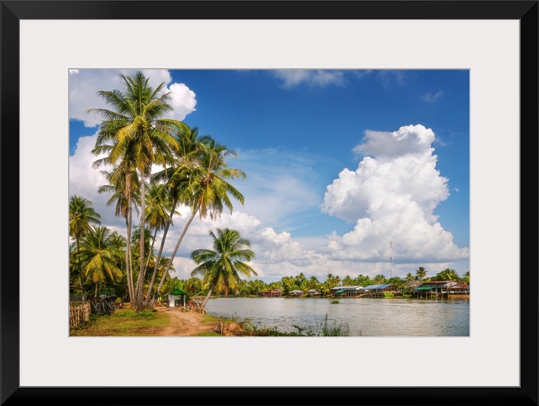 <p>Asian landscape with palm trees and a blue sky with clouds</p>