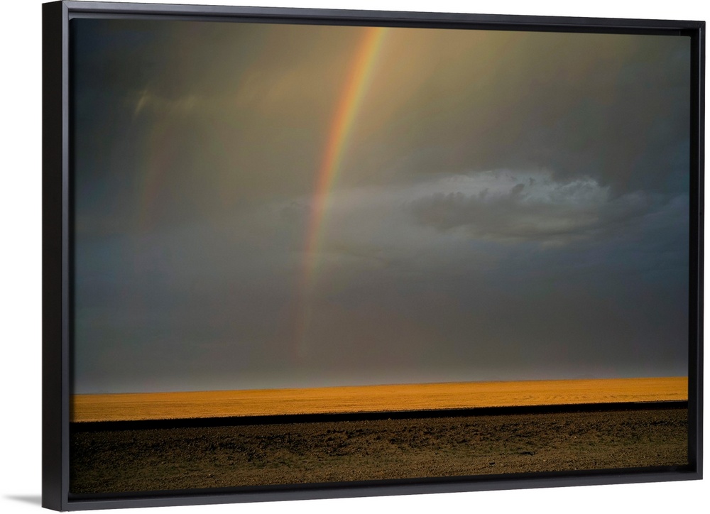 <p>Landscape photograph of an open landscape with golden fields, a contrasting dark road, and a rainbow in the gray and blue sky.</p>