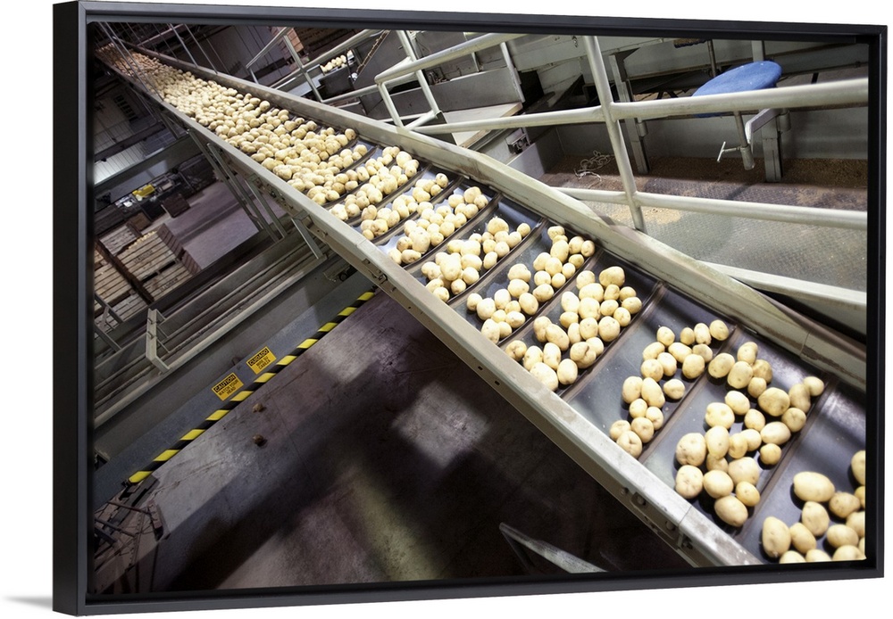 <p>Potatoes being processed and sorted on conveyor belts on a potato farm.</p>