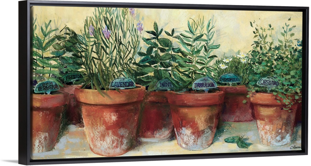 <p>Contemporary painting of different herbs in separate clay pots.</p>