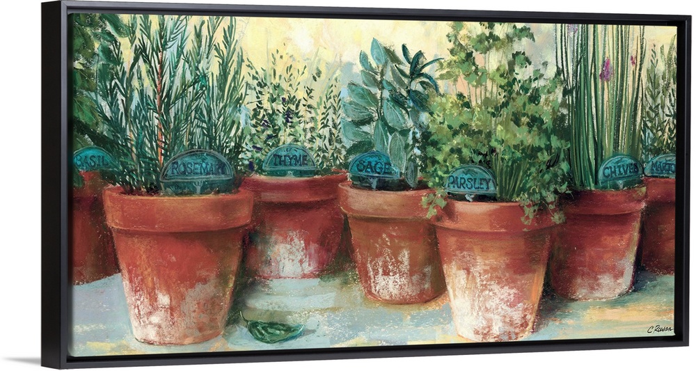 <p>Contemporary painting of different herbs in separate clay pots.</p>