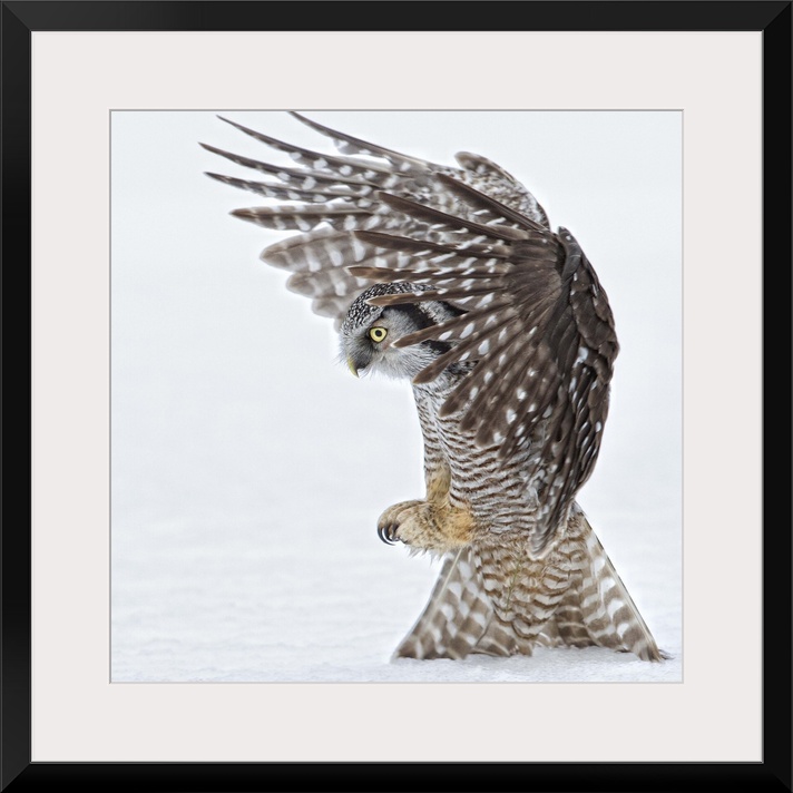 <p>Portrait of an owl landing to the ground with its talons ready to open.</p>