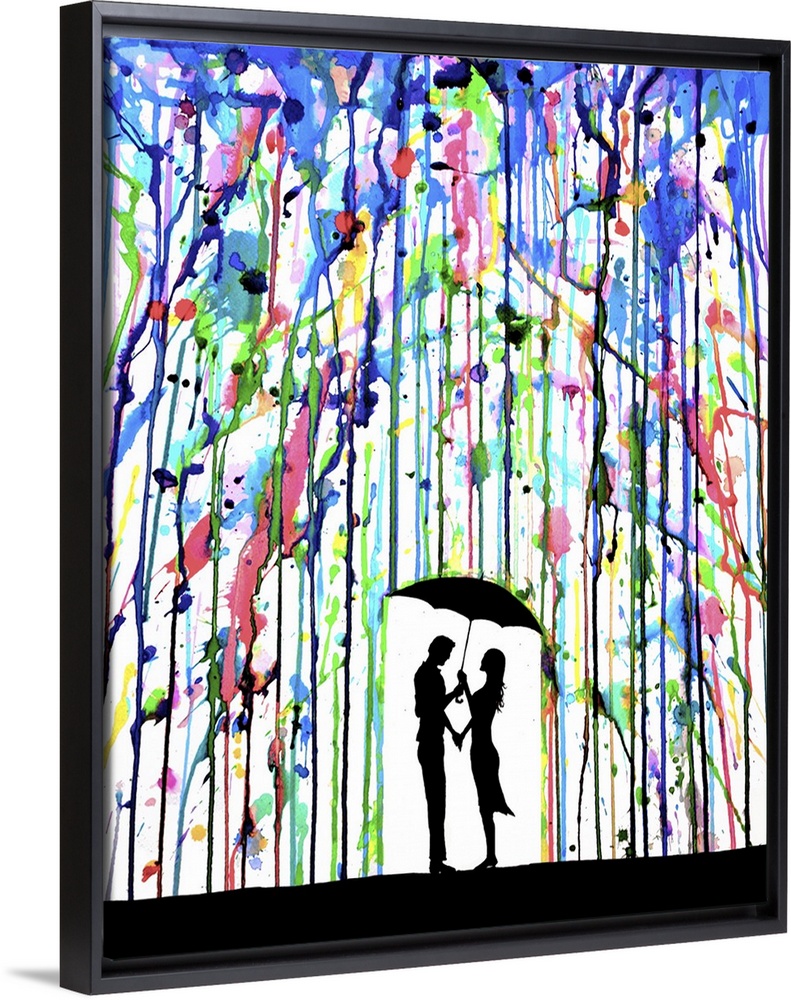 <p>Watercolor and ink painting of a silhouetted couple with an umbrella under colorful rain.</p>