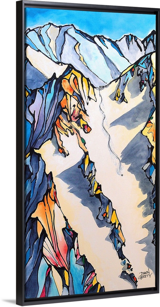 <p>A bright contemporary painting of a single skier carving down a mountain valley, with bright colors suggesting the sunlight hitting the tops of the mountain peaks</p>