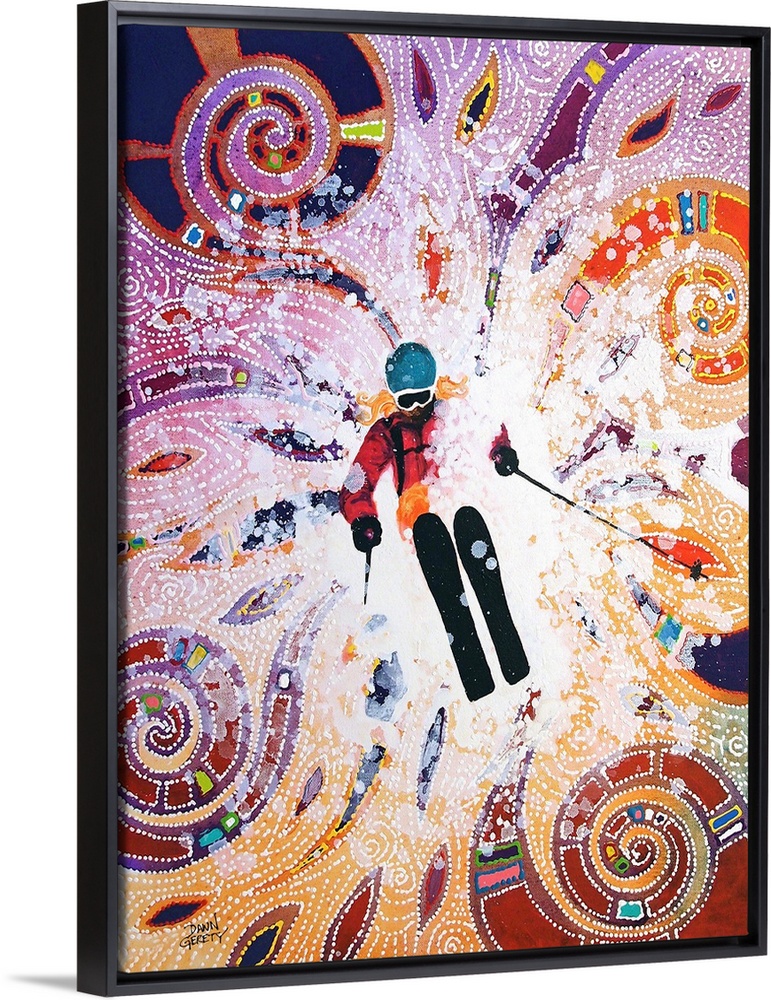 <p>Dawn Gerety was born in Sydney, Australia and raised across the globe in Girdwood, Alaska. As a lifelong Alaskan, she is moved by the natural splendor that has surrounded her her entire life – mountains, wildlife, rivers, wildflowers and outdoor activities. Dawn paints these images and creates her own language with a swipe of color or a rigid line of dots. She injects a fiercely whimsical vitality to Alaskan icons the only way she knows how.</p>