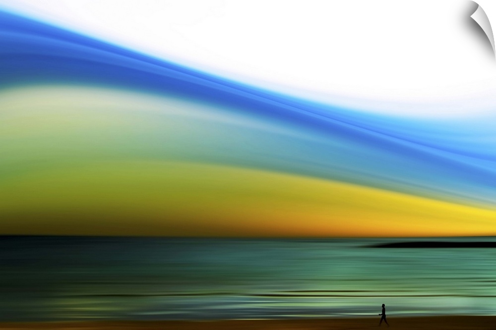 <p>Wall art of a person's silhouette walking on the shore of a beach with an abstractly colored sky.</p>