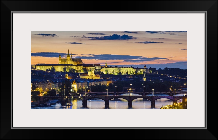 <p>Czech Republic, Prague. Prague Castle, Pazsky Hrad, and the Vltava River at sunset from the Vysehrad.</p>