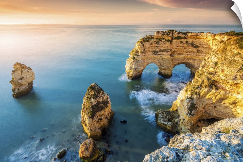 <p>Praia de Marinha, Caramujeira, Lagoa, Algarve, Portugal. Coastal rock formations at sunrise.</p>