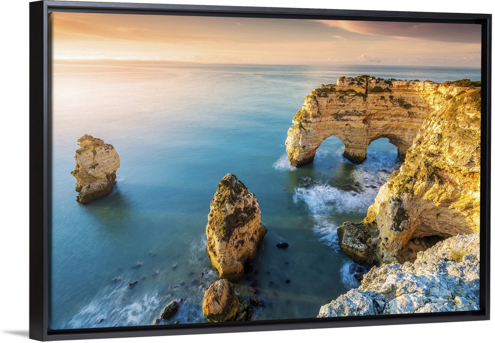 <p>Praia de Marinha, Caramujeira, Lagoa, Algarve, Portugal. Coastal rock formations at sunrise.</p>