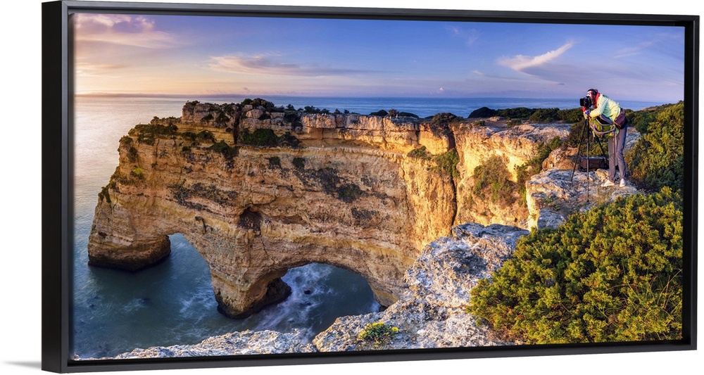 <p>Praia de Marinha, Caramujeira, Lagoa, Algarve, Portugal. Panoramic view of a woman photographing the sunrise from above the cliffs.</p>