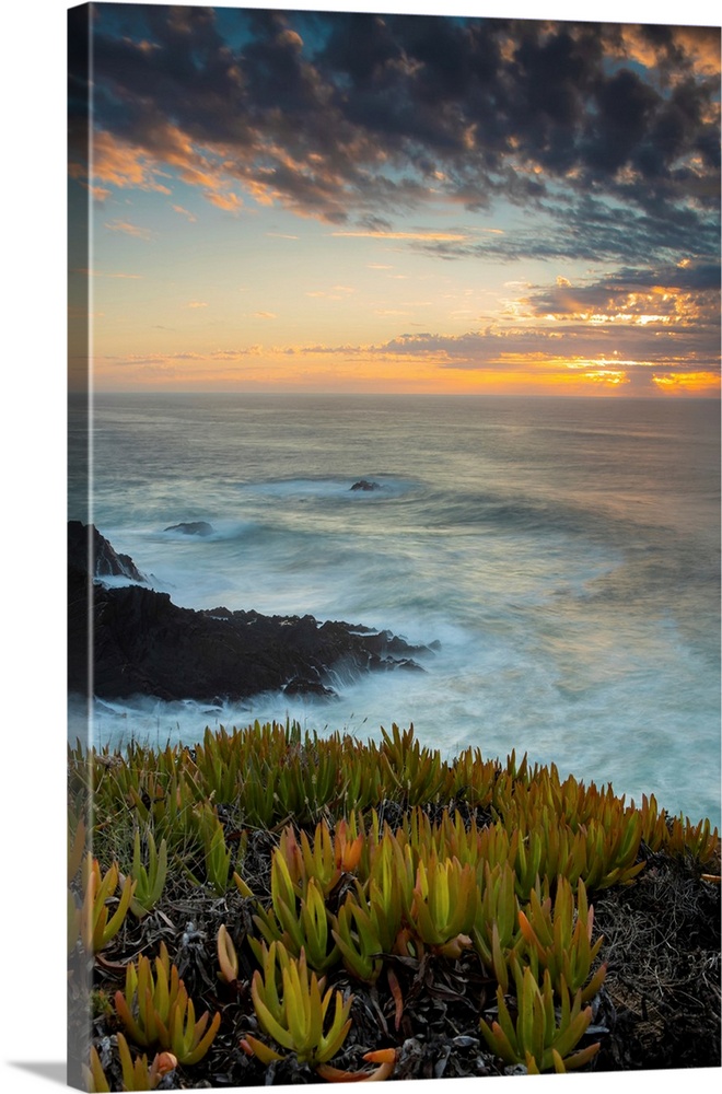 <p>Praia do Carvalhal with a dramatic sunrise over the horizon, Alentejo, Portugal</p>