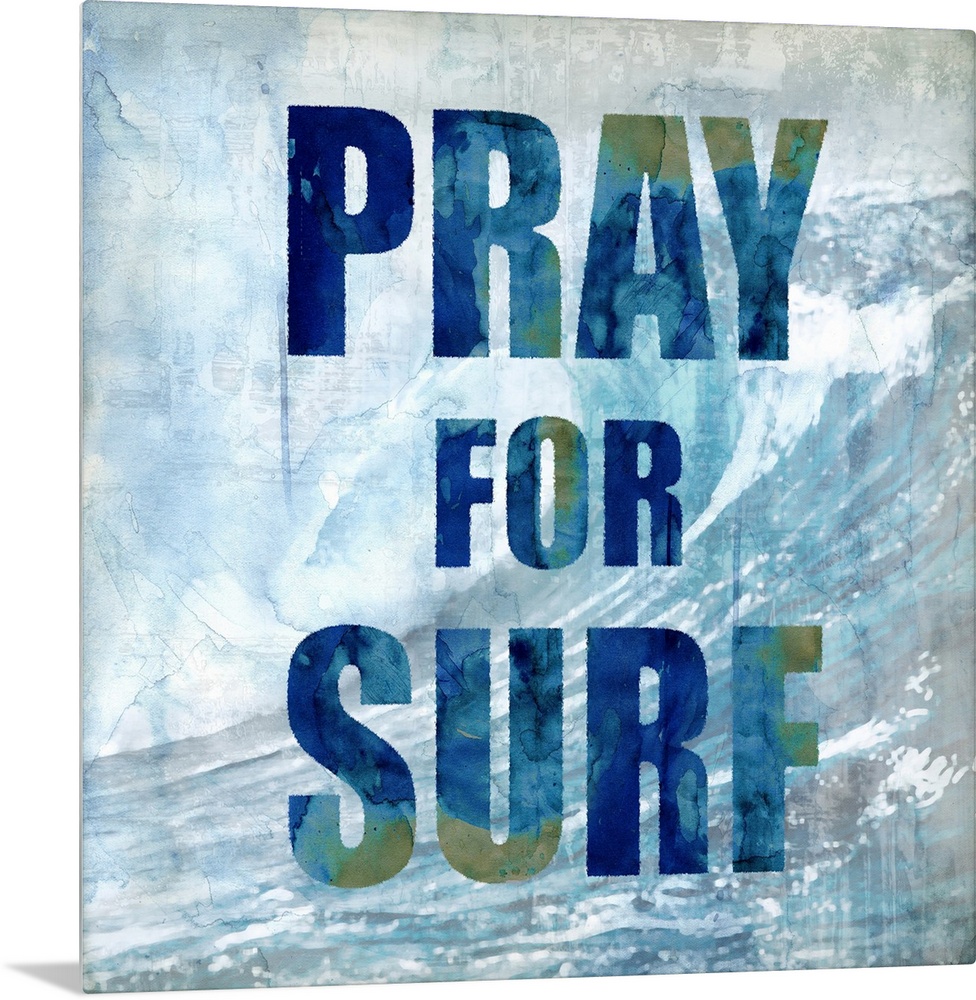 <p>Square beach themed decor with a large wave in the background and "Pray for Surf" written on top.</p>