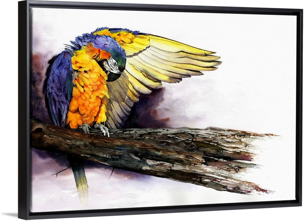 <p>A colourful watercolour painting of a macaw parrot preening his feathers before taking flight.</p>