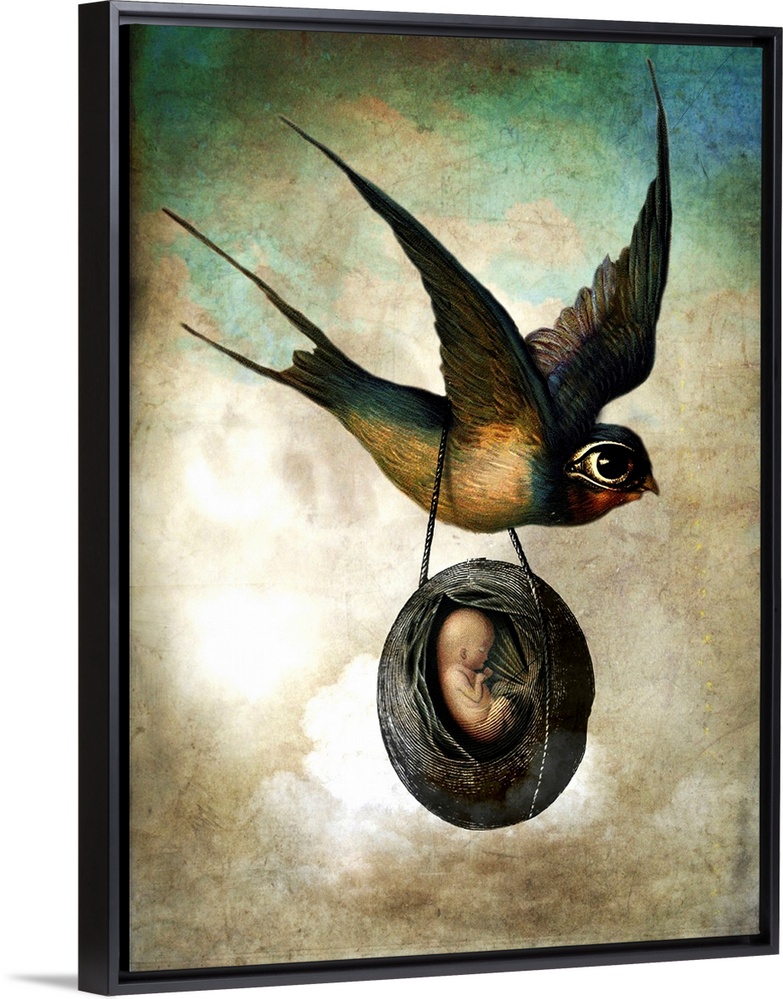 <p>A bird with an over-sized eye carrying a husk with a unborn human baby in it.</p>