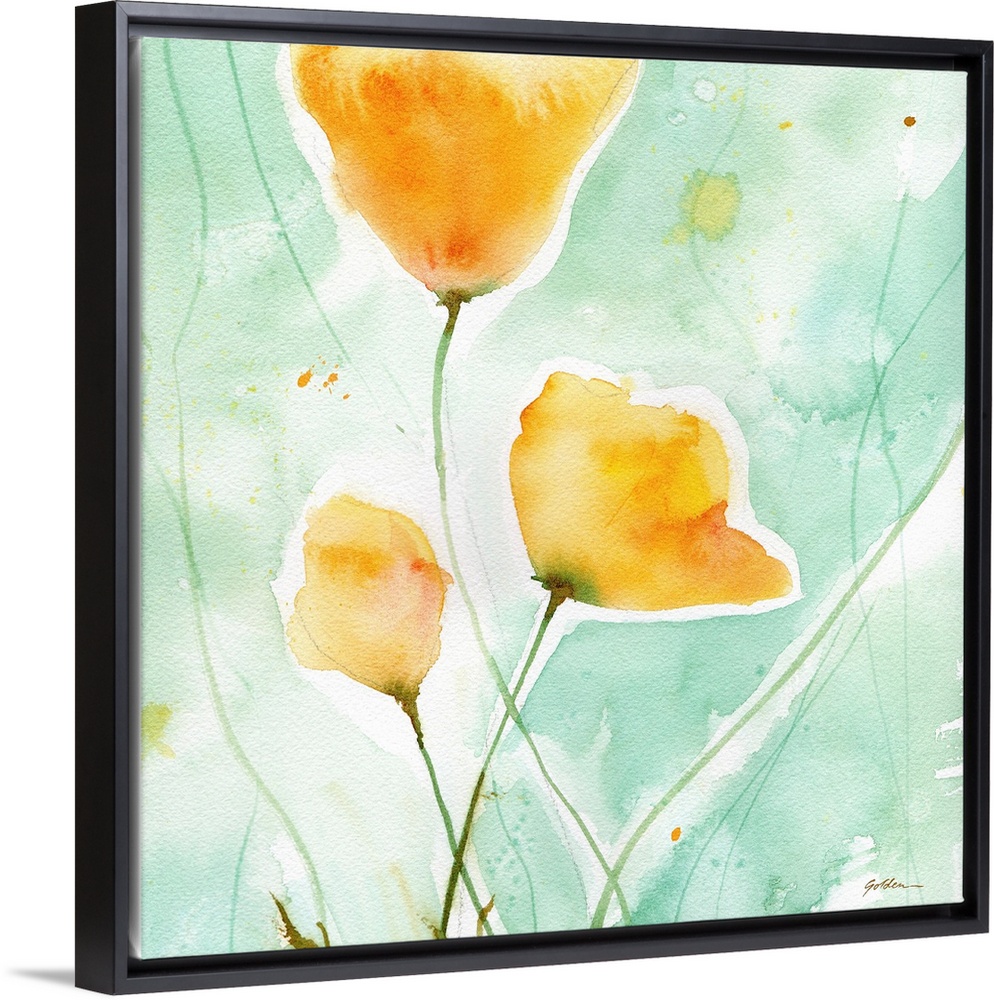 <p>Contemporary watercolor painting of yellow poppies on a light blue background.</p>