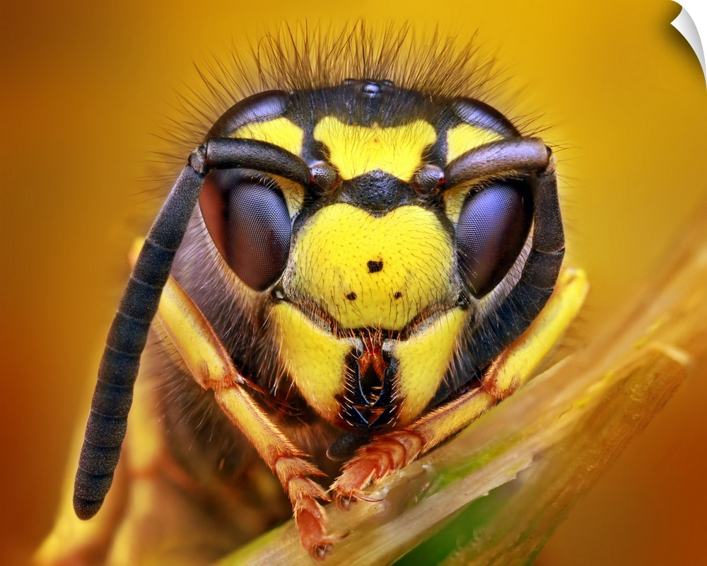 <p>Macro photo of the head of a wasp, missing one antenna.</p>