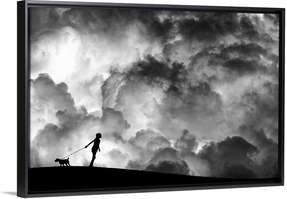 <p>A girl holding a dog on a leash in silhouette against a background of dramatic clouds.</p>