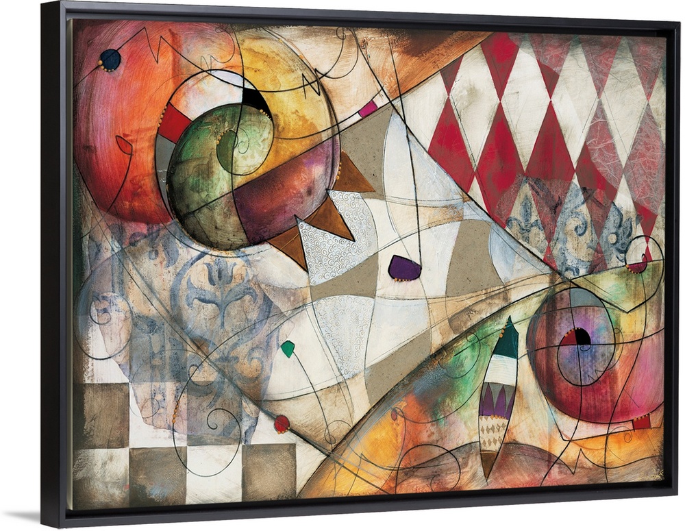 <p>Premiere I by Eric Waugh. A colorful square abstract painting of striking shapes against a checkered background.</p>