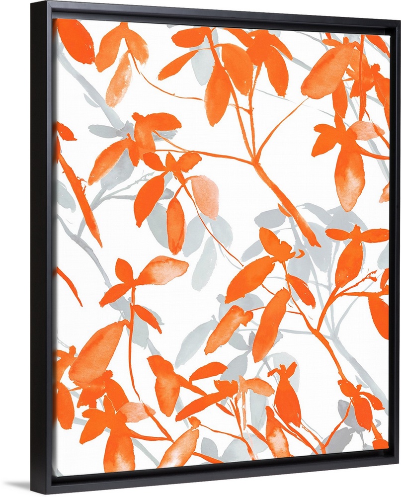 <p>An abstract watercolor painting of branches of leaves in colors of orange and gray.</p>