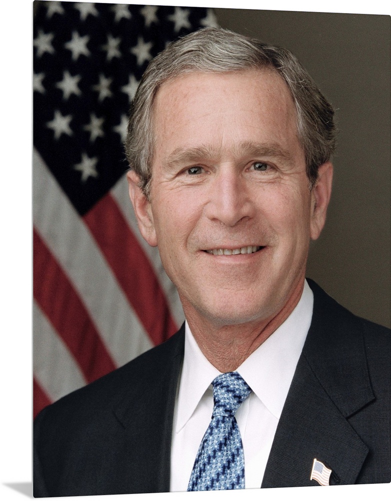 <p>President Bush poses for his official portrait in the Roosevelt Room, wearing a blue tie. Library of Congress, Prints and Photographs Division.</p>