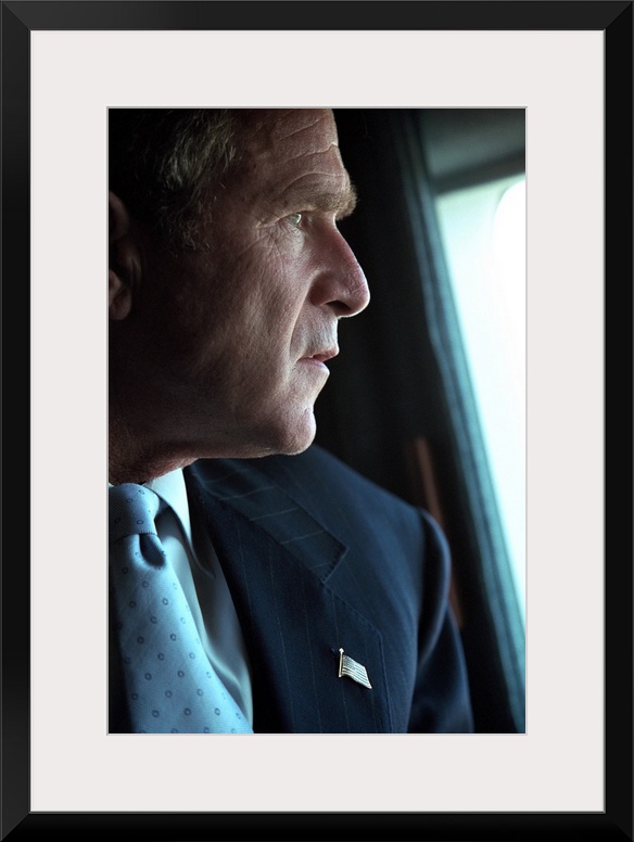 <p>President George W. Bush surveys the damage to the Pentagon from Marine One, Sept. 14, 2001. Three days after the 9-11 Terrorist Attacks, Bush 43 was enroute to New York City to visit the devastated World Trade Center site.</p>
