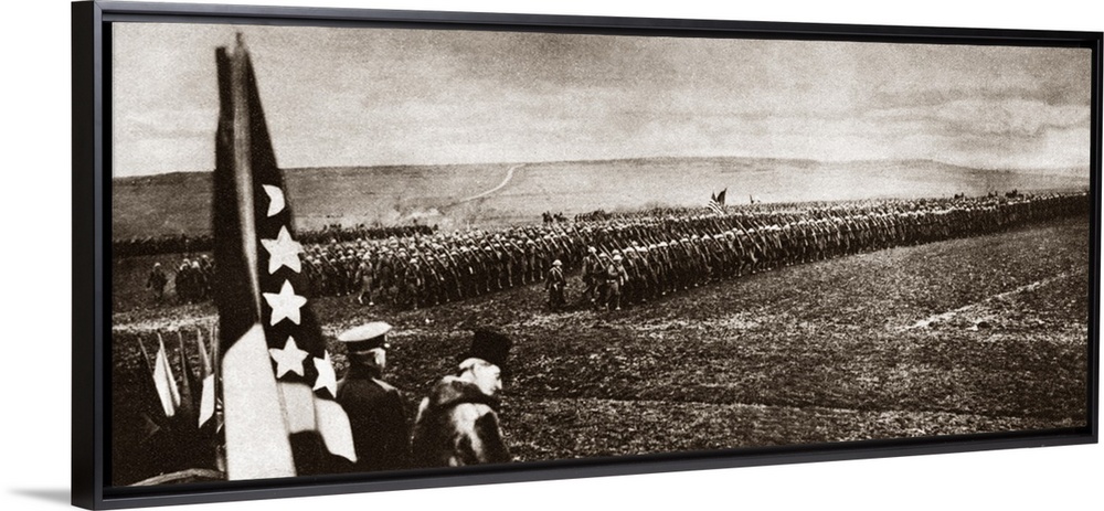 <p>President Wilson and General Pershing review United States Troops on Christmas Day at Army Headquarters in Chaumont, France. Photograph, c1919.</p>
