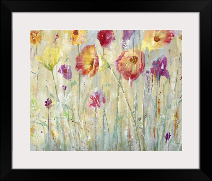 <p>A contemporary painting of vibrant red purple and yellow flowers in a garden.</p>